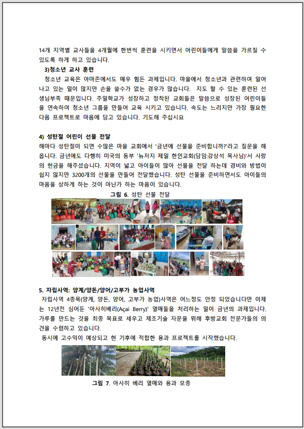 3. 아마존 14개 지역 2개의 언어권 교사들위한 25년 3차 훈련을 했습니다. 4. 후방교회 지원으로 약 3200명의 어린이를 위한 성탄 선물을 전달 했습니다.