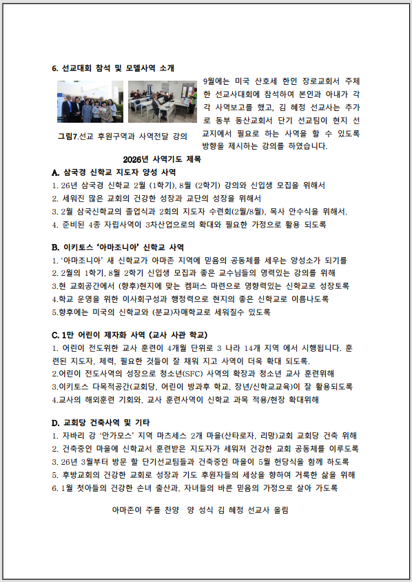 할렐루야! 25년 사역가운데 함께 역사 하신 하나님께 감사드리며, 기도와 물질로 후원하신 교회와 동역자님들가정에 신실하신 주의 은총이 26년 새해도 충만 하시기를 빌면서 25년 4분기 사역요약을 전송합니다.