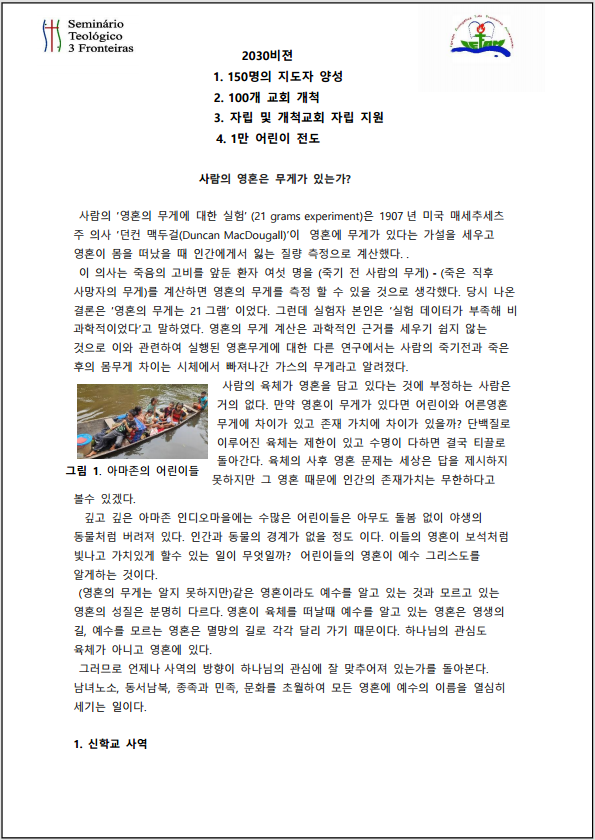 1. 새롭게 시작한 아마조니아 신학교 학생들은 방학기간중 영성훈련을 했습니다. 2. 아마존 깊은 마을 두곳에 교회당 건축을 하기로 했고 지도자를 훈련하고 있습니다.